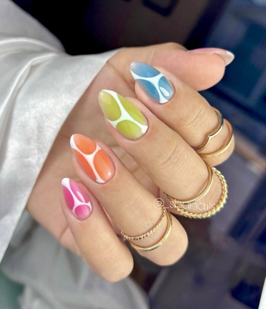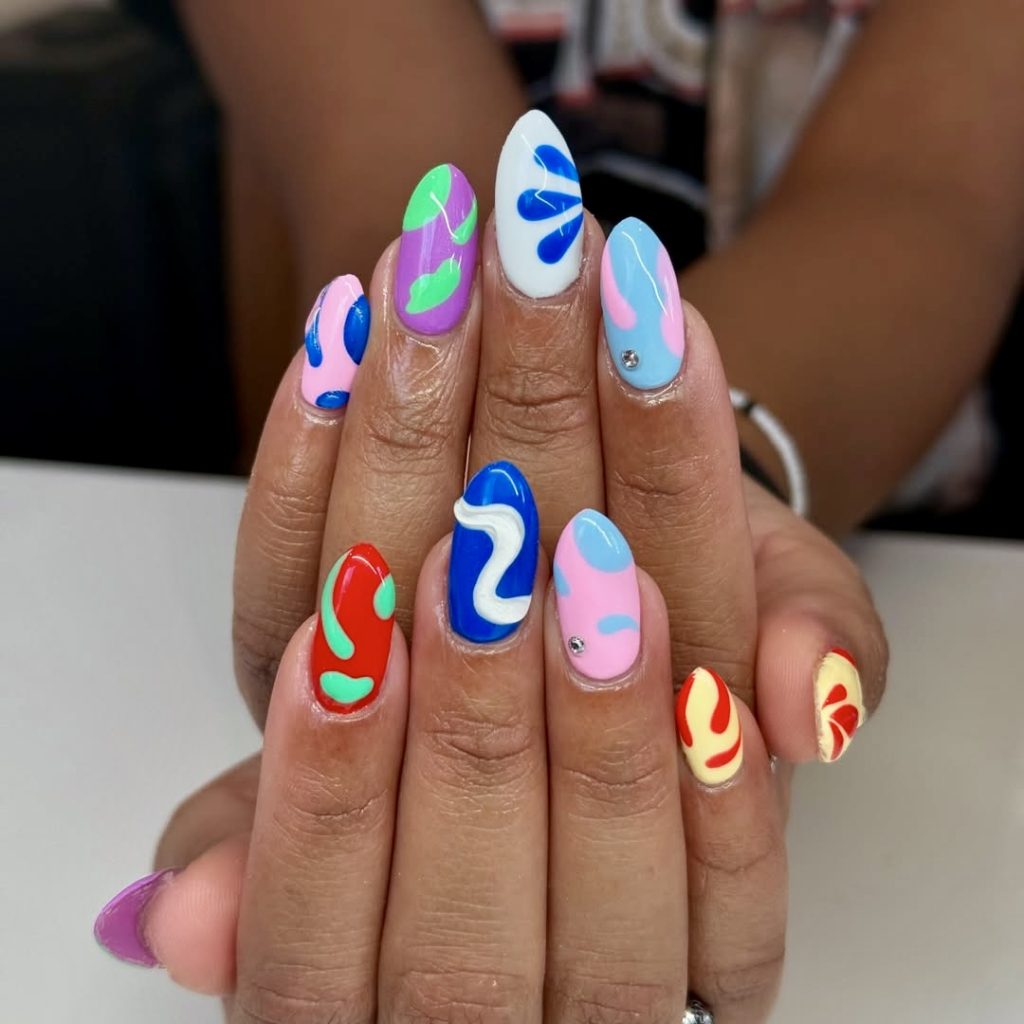Vivid and vibrant, this colorful set is a perfect addition to your summer nails 2025 lineup. Each nail is decorated with a different abstract splash or squiggle in combinations like red and mint green, cobalt and white, or pink and sky blue. The gel finish gives the designs a more realistic look and the almost 3D matte shines increase the contemporary vibe. Suitable for those who like the idea of pairing their nails with statement accessories or contrasting fabrics like denim and silk. With a short to medium almond shape this set is both wearable and bold, thus making it an everyday go-to style piece.