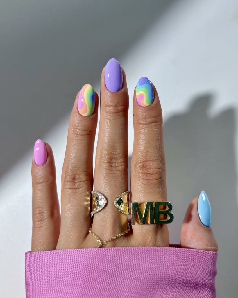 The dreamy gradient appeal unites sky summer clouds wonderful softness and the bold outlines and upbeat. Blurred colors ranging from peach to coral, lavender, and aqua can either be bordered with pristine colors or be used alongside geometric art. Looking at this gel set that is almond nail shaped gives one a modern and artistic impression. It goes well with silky tops or simple clothing that needs a color pattern to be added. This design, which is apt for sunset dinners or roof garden gatherings, is one of the 2025 pastel ideas that have proven that pastels can be far from ordinary.