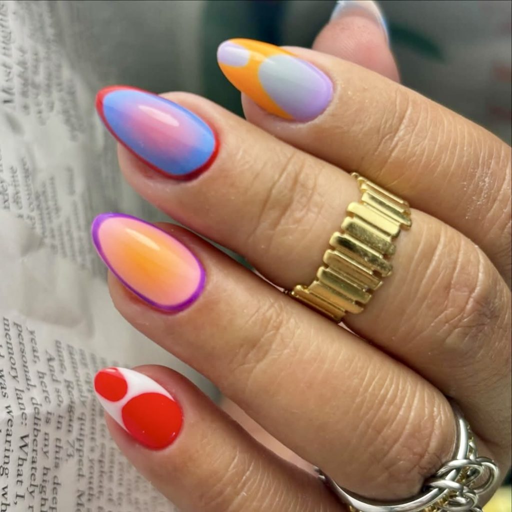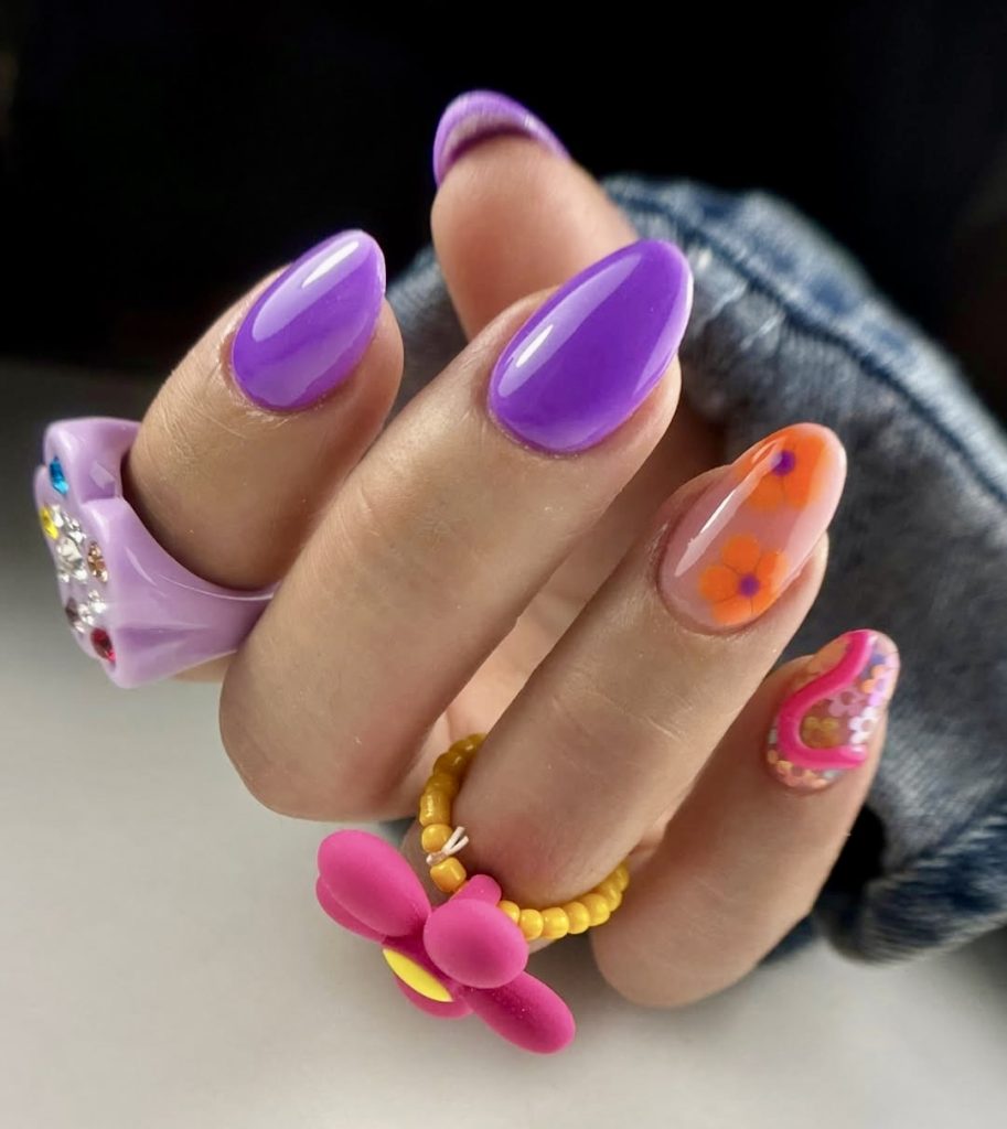 Whimsical summertime and glossy gel texture make this set a dreamy mix. A pale almond-dipped purple nail with orange ombre and tiny purple flowers brings a sense of nostalgia, which we get when we think about a flower chain, and with a modern twist. The last step is?-A hooped pattern nail in neon pink and orange that only adds retro vibes without overdoing it. What is an easy pick among the pieces that are modern stylish women looking for amusing designs that can go with all kinds of occasions like the BBQ on the roof and the festival weekend?
