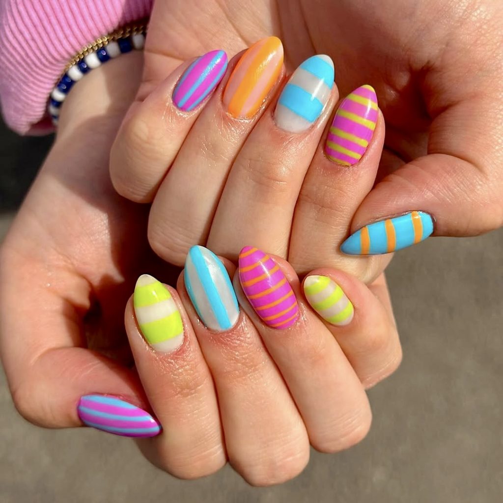 27. Neon Candy Stripe Nails