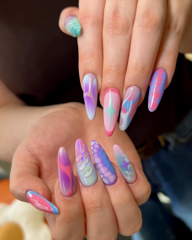 This one is for the girl who is a mermaid by heart. This nail set is made of long and almond acrylic shapes and is covered with soft pastel colors such as lavender, blush, mint, and baby blue that swirl and be accented with scales, stars, and 3D gloss. It gives a lovely, fairytale color design that is both modern and magical. If you are a person to wear dresses that fly, sparkling rings, and be someone with a tinge of magic, this design is a perfect one for you. The definitely outstanding piece of the 2025 nail trend scene for those who want length, shine, and the sparkle of children’s fairy tales.