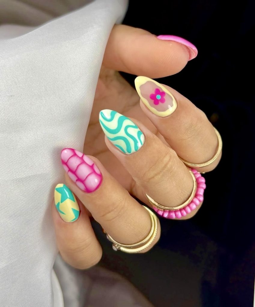 Your fingertips will look like a summer party in a bottle with this brave and vibrant nail set. Each of the nails exhibits a different design, such as a 3D hot pink bubble grid, teal retro waves, and even a translucent almond-shaped flower accent, making it the perfect combination of bright, cute, and quirky. The colors pink, yellow, and aqua are used to the maximum and create a fun-loving atmosphere associated with vacation, swimming pool cocktails, and 2025 energy. These nail shapes are chic and lively — perfect for the one who wants to be casual but at the same time has a desire to get all the attention.