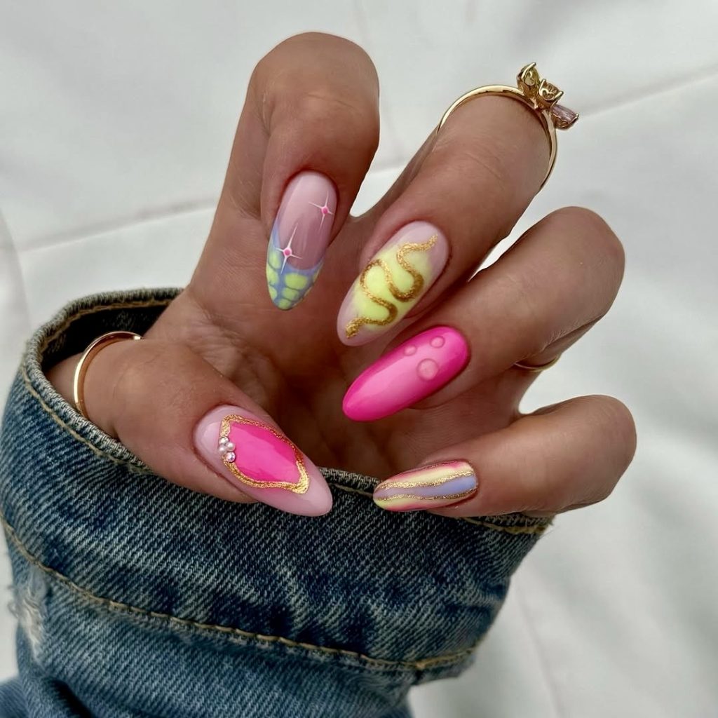 The Barbiecore idea has taken a different route which is really fun and colorful. This set has gold color accents, bright pink, and a mix of shapes and designs. The different designs feature bouncy pink chrome to wavy snake neon and abstract art with a golden frame places on almond-shaped tips. This is the kind of look that is both sweet and punk, and the unique aspects of it, such as the jelly bubbles and different surfaces, make it an exceptional one in any summer lookbook. For instance, an afternoon with the beach club and then the dance-all-night parties.