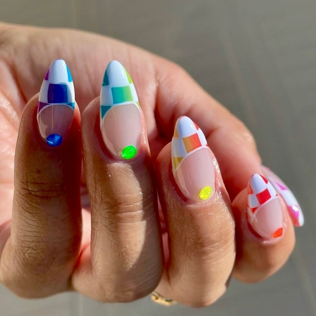 This design 2025 set is heaven for you overly trendy people interested in futuristic minimalism with a twist. The white tips and neon color blocks are remarkably vivid since they are placed on a translucent base,each one finished with a pearl-like glossy dot that light dances on in the right way. The four-square sections of blue, green, orange, and red are arranged in a checkerboard pattern — tidy yet never unexciting. This style is for the ones who prefer simplicity, which is appealing, and the latest trendy with the color combinations that brighten up under the sun.