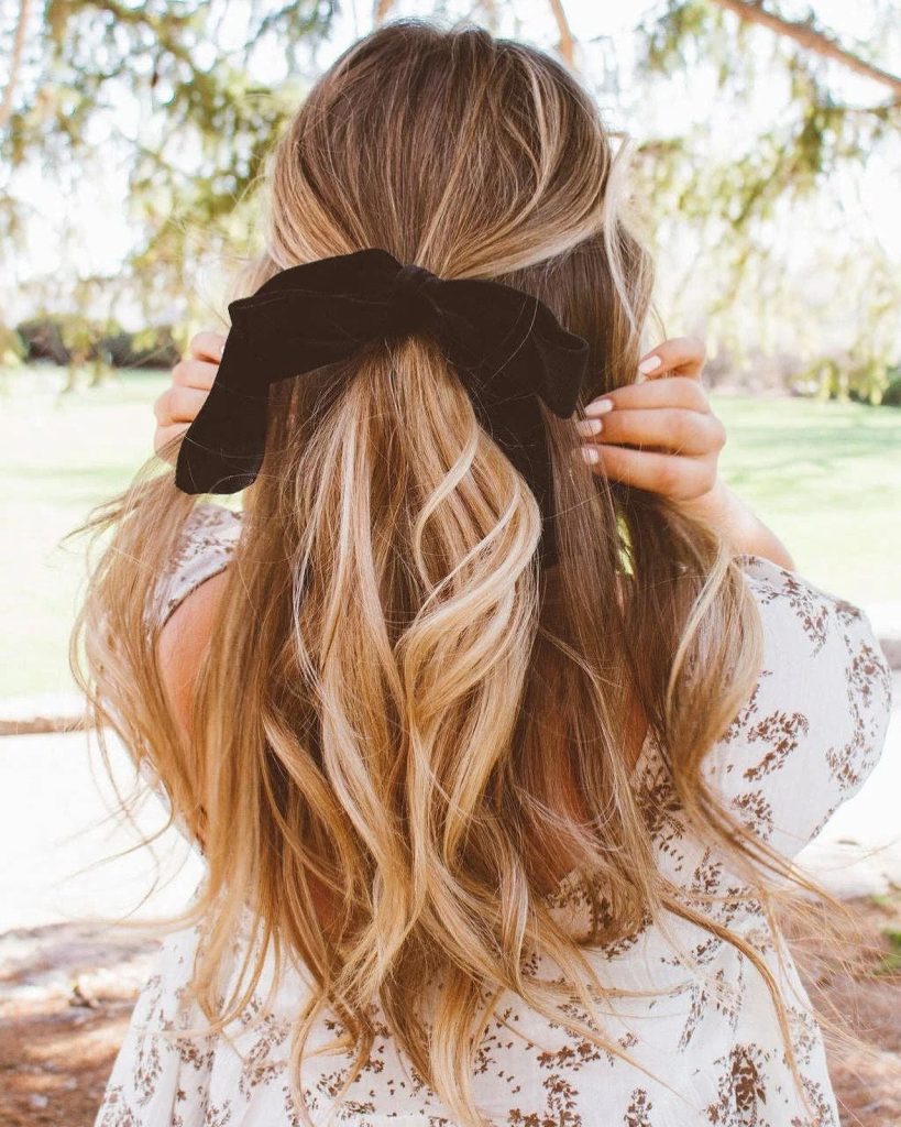 The half-up, half-down hairstyle with soft waves is pulled back up with a luxurious black velvet ribbon. The smooth, dark ribbon and the light blonde highlights in the hair create a visually appealing and aesthetic contrast. This casual, event, or even a baseball game outfit with the addition of a styling twist is the most ideal.