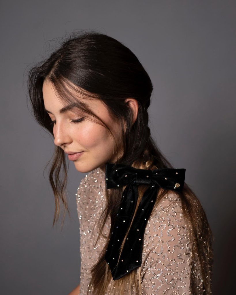 soft, loose waves are combined with a black satin ribbon, which is tied at the base of a low ponytail, thus constituting a look that is both classic and adorable. This hairstyle is not just appropriate for pictures, but it can also be worn at casual outings and even soccer games, giving the wearer the dual benefits of comfort and style. The very simplicity of this ribbon makes it a perfect choice for the softness it brings, thus it could be worn with any type of outfit for any occasion.