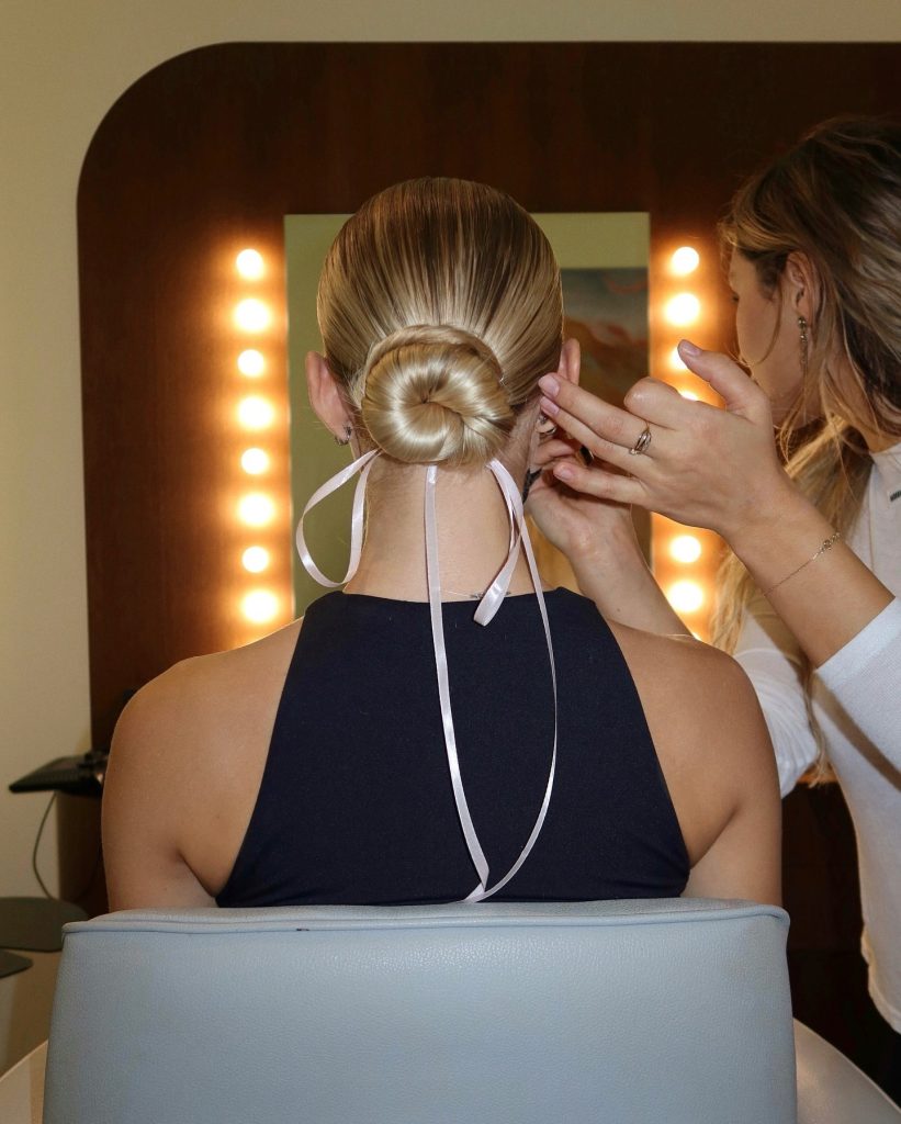 Linked above this simple but sophisticated bun is a slender ribbon of pink color that is beautifully knotted at the end. The ribbon gives the sleek and orderly style a feminine touch and makes it suitable for the office, volleyball training, or a fashionable evening. This look is ideal with mid-length or short hair and, therefore, demonstrates the range’s adaptability and style.