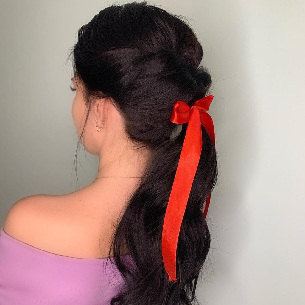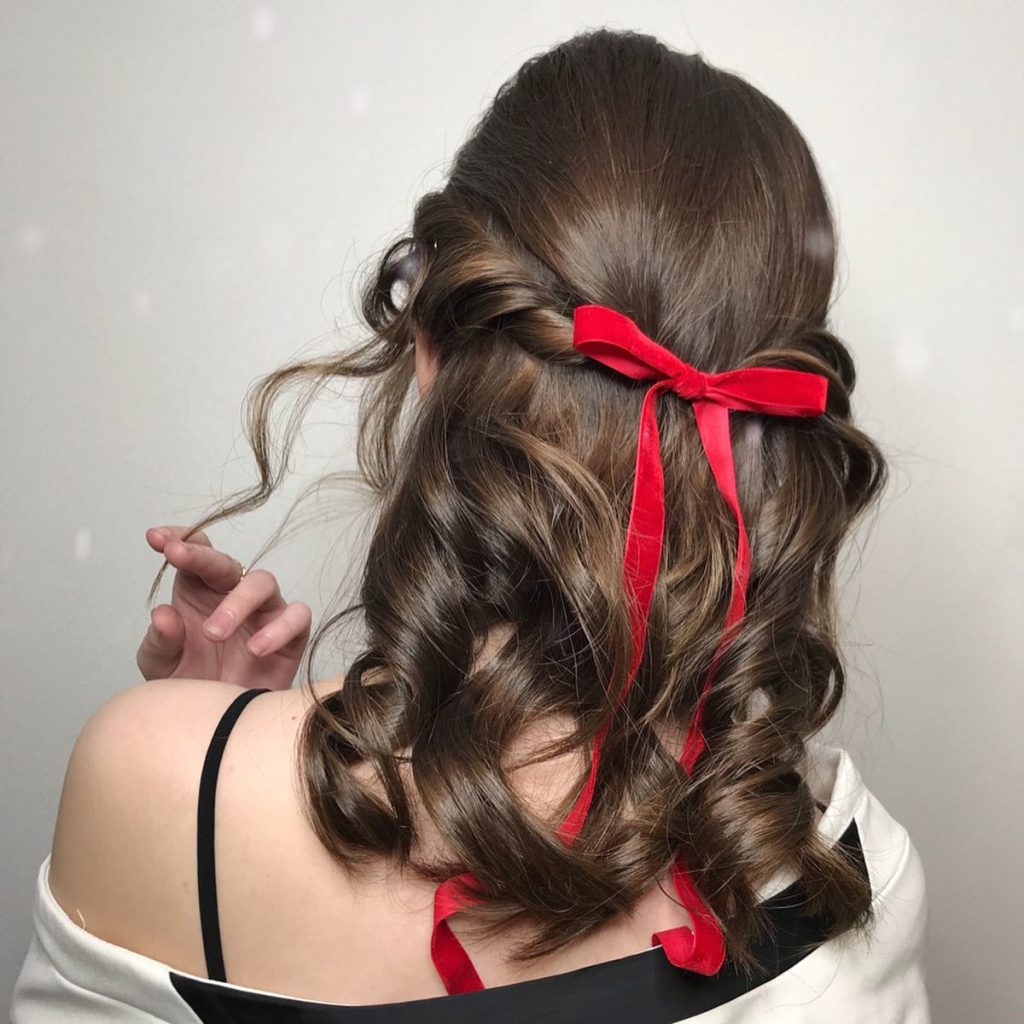 Bouncy and curly the hairstyle is tied with a red velvet ribbon making the hairstyle very romantic. The color deep red brings in a festive and dramatic style, therefore, this hairstyle is wonderful for holiday parties, weddings, or date nights. The look of this style works very well with either long or medium-length hair.