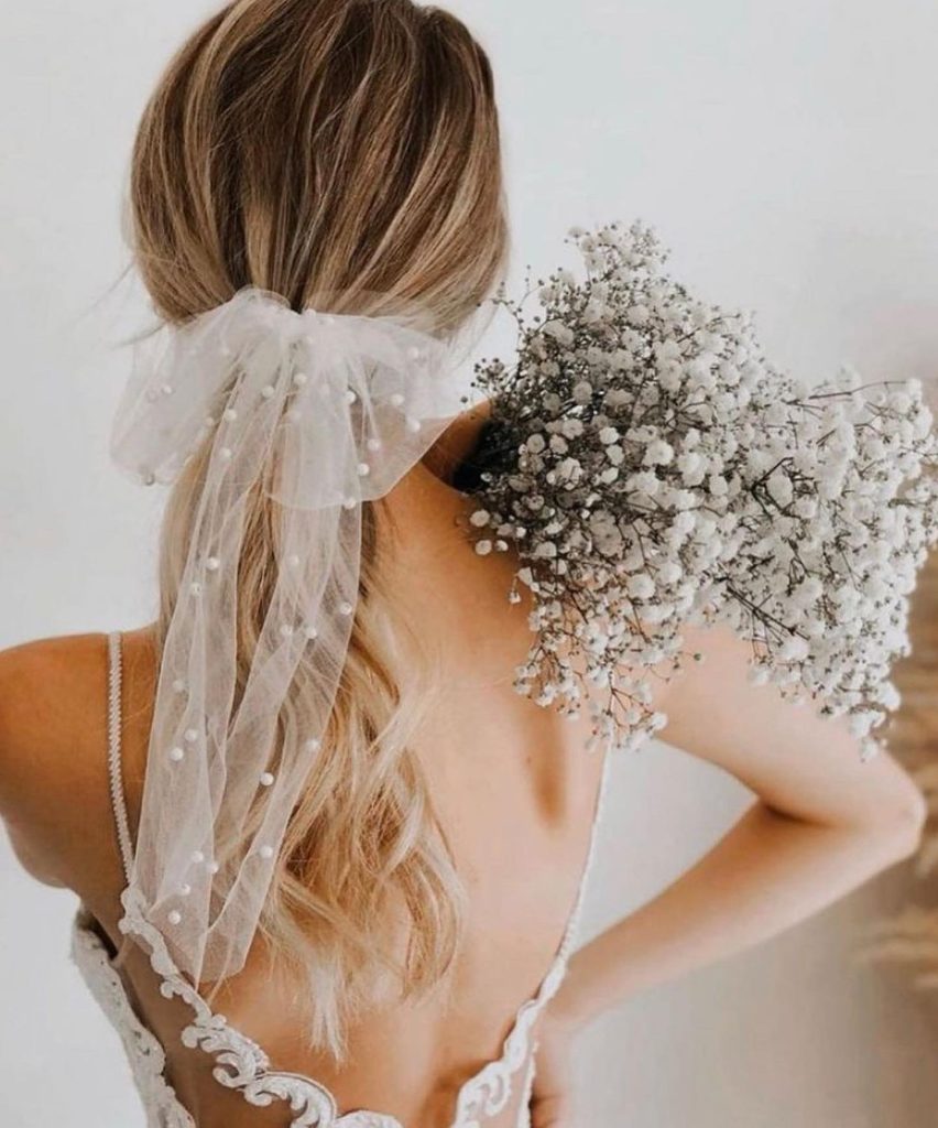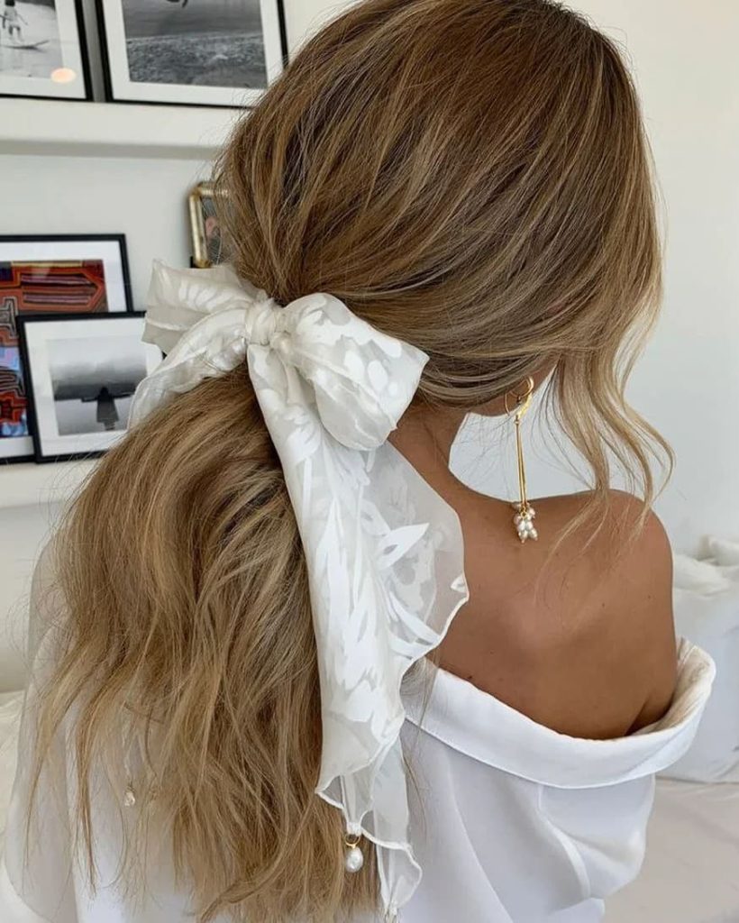 13. Tousled Low Ponytail with a Sheer White Ribbon