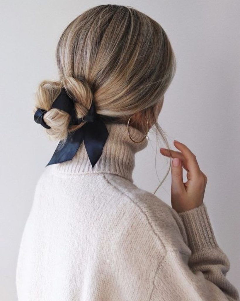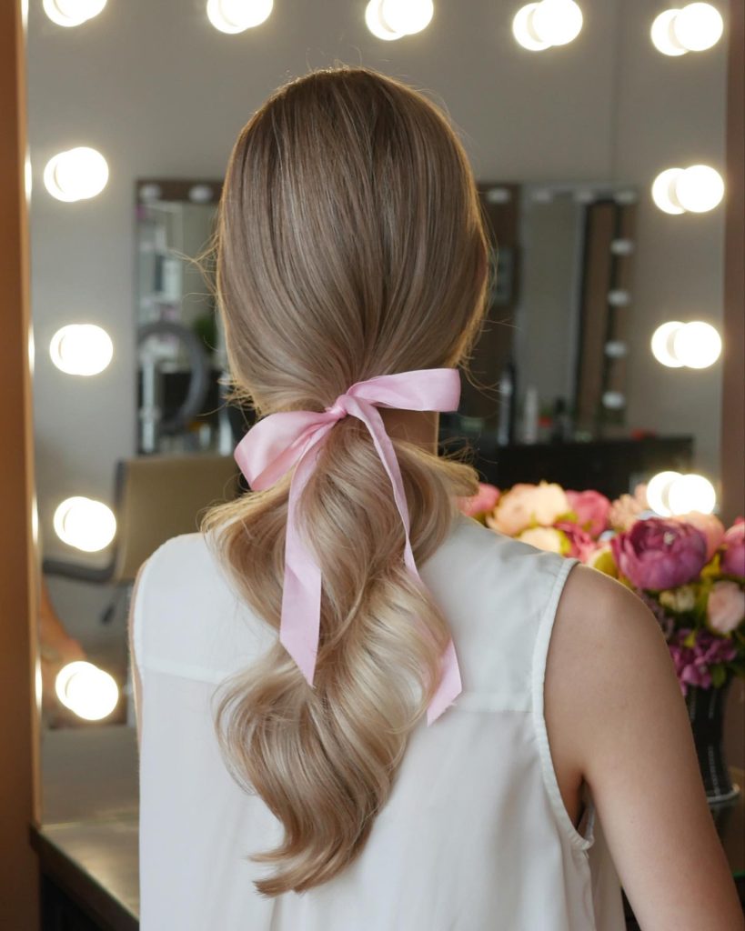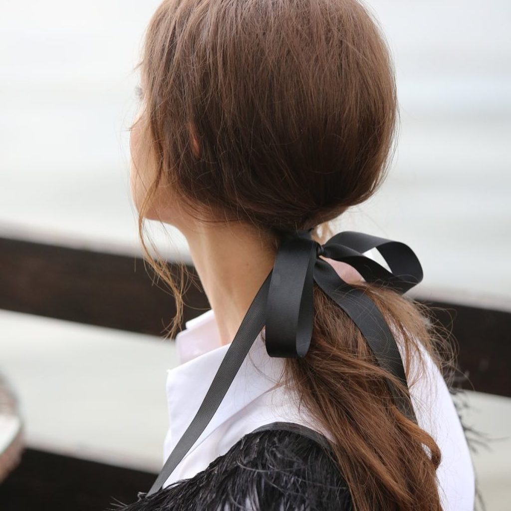 This low ponytail is simply tied with a classic black satin ribbon in a neat bow, making it look so elegant. The simple style is a total look with it for any woman, such as to dinner, a wedding, or even a workday. The black ribbon, being the only dark element, pairs in a beautiful way with the light hair, precising the style.