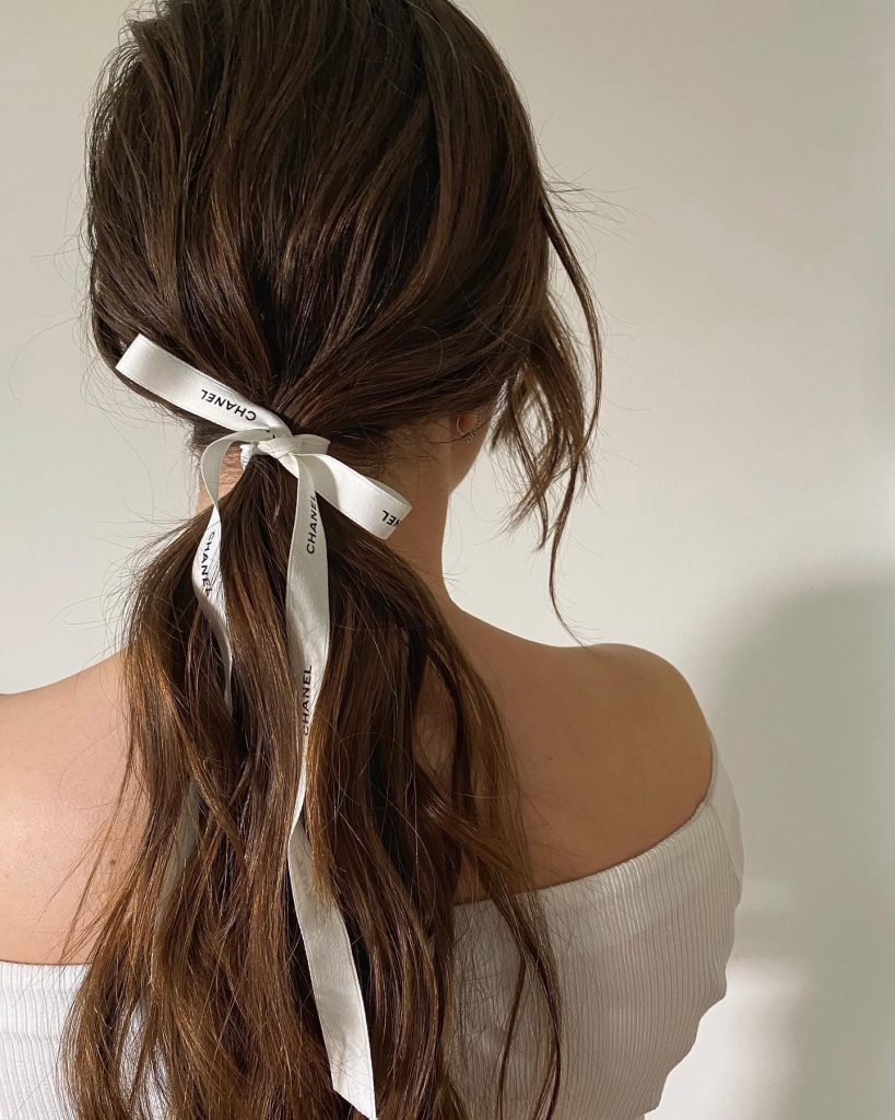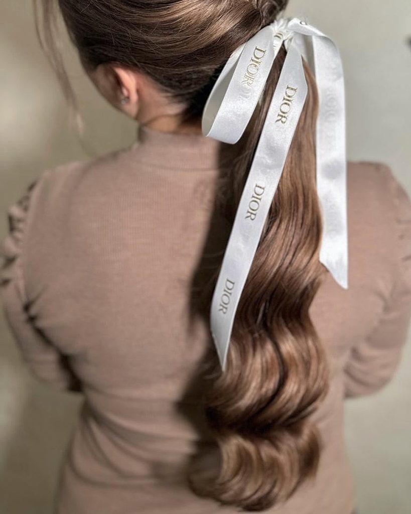 A classic low ponytail gets a stylish upgrade with a branded white ribbon attached at the base. The ribbon serves as a luxurious piece, which makes minimalism meet sophistication. This hairstyle is a great option for the office, gameday parties, or casual get-togethers, making it possible for long and medium-length hair.