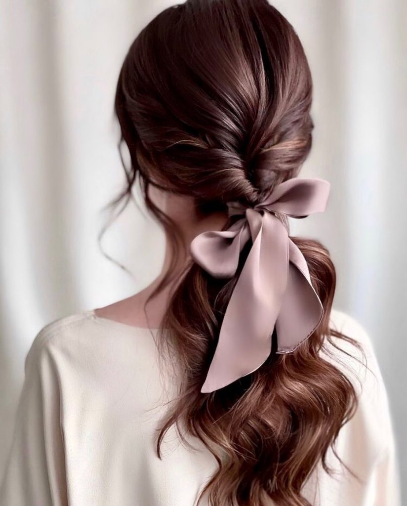 A half braided spiral with one leg down and one leg up style with the taupe satin ribbon in a bow shape as the accent is the one you are looking for. The ribbon is an accessory that gives a romantic and classic vibe along with the soft waves which are ideal for weddings or classy parties. This hairstyle will also do justice to both long hair and medium hair length.