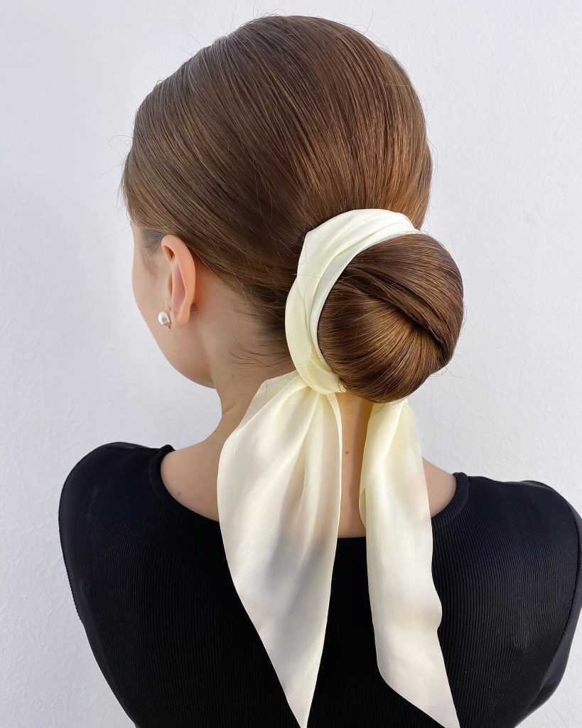 22. Classic Low Bun with a Cream Ribbon Wrap