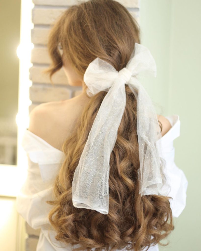 Generously packed voluminous spirals make this hairstyle look heavenly and the sheer glittering bow that is added completes it. The gigantic bow not only serves as a funny little detail but also contributes to the aesthetic side of the entire appearance, therefore, it can be considered as a delightful addition to a photo shoot, a holiday party, or a date. This hairstyle, which is mainly boght for long hair, is a symbol of dignity and a way to demonstrate it.