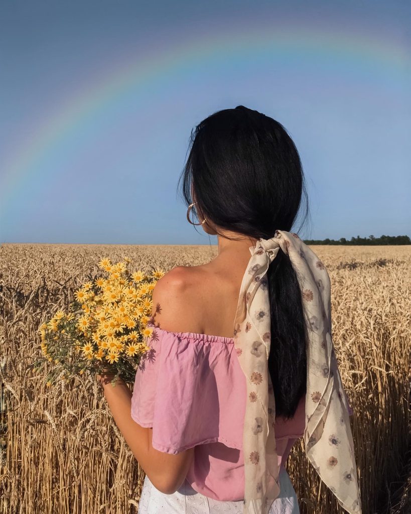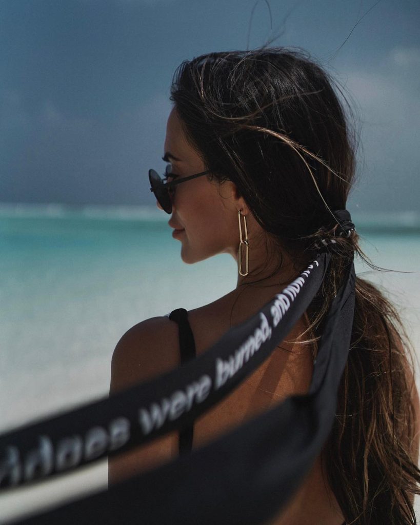 Loose waves bound with a printed silk scarf ribbon embody the free-spirited and laid-back atmosphere in this look. The scarf is a stylish and colorful accessory, perfect for the summer excursions, holidays, or even sporting matches. This style is made possible by the long hair that adds fluidity and depth of field.