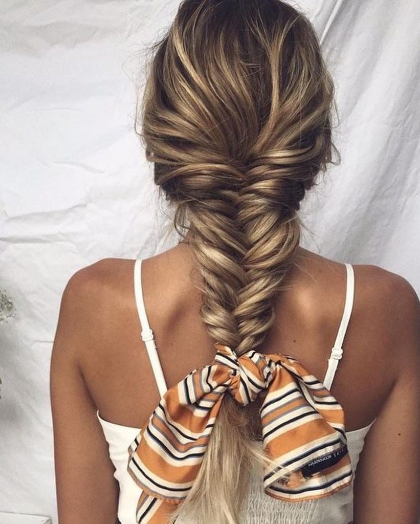 A charming fishtail braid is complemented by a brightly striped scarf ribbon that is fixed at the end. The scarf adds a color splash and a fun atmosphere, which is a summer choice, casual events, or beach days. This hairdo is wonderful for long hair.