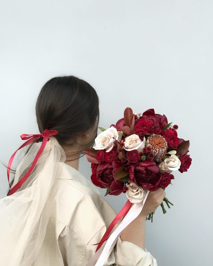 A low ponytail enhanced with drape-like red and white ribbons is a perfect accessory for a bridal bouquet or an outfit for the holiday season. The ribbon tied to the hair adds a charming and soft comforting touch that makes it the ideal style for celebrations or romantic occasions. This hairstyle is suitable for medium-length or long hair.