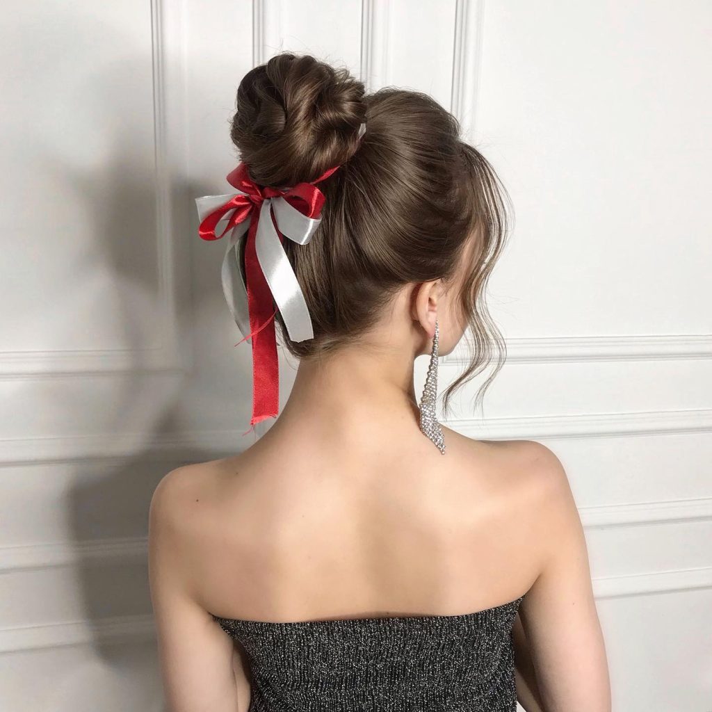 A high twisted bun gets the most attention with the aid of bold red and white ribbons in a noticeably full bow at the base. This charming style is appropriate for Christmas parties, formal events, or any gathering where you want to be noticed in a classy and playful way. The hairstyle is optimal for medium-length hair.