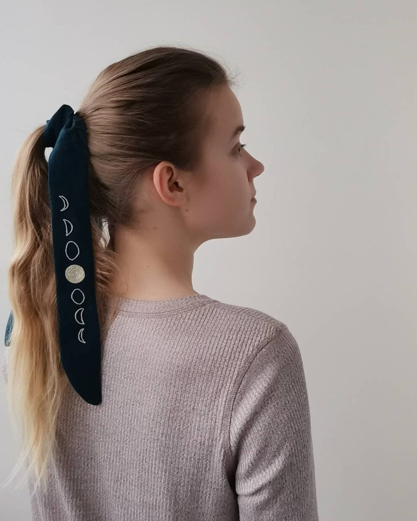 A navy ribbon embroidered with moon phases gives the high ponytail a touch of fantasy and makes it look more different. This hairstyle can be worn for informal settings, school, or a day trip and it represents the perfect union of art and utility. It is only suitable for hair that is medium length.