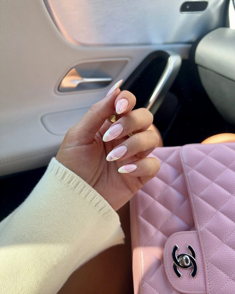This ombré gradient that blends green, lilac, and pink is nothing but French dreams. It makes the classic style look completely different in 2025. The white tips create a stark contrast, and the pastel tones offer a tender and lovely look. It is the ideal harmony of the simple and the colorful—finding it as a choice of elegance that is not so hard for anyone is this season.