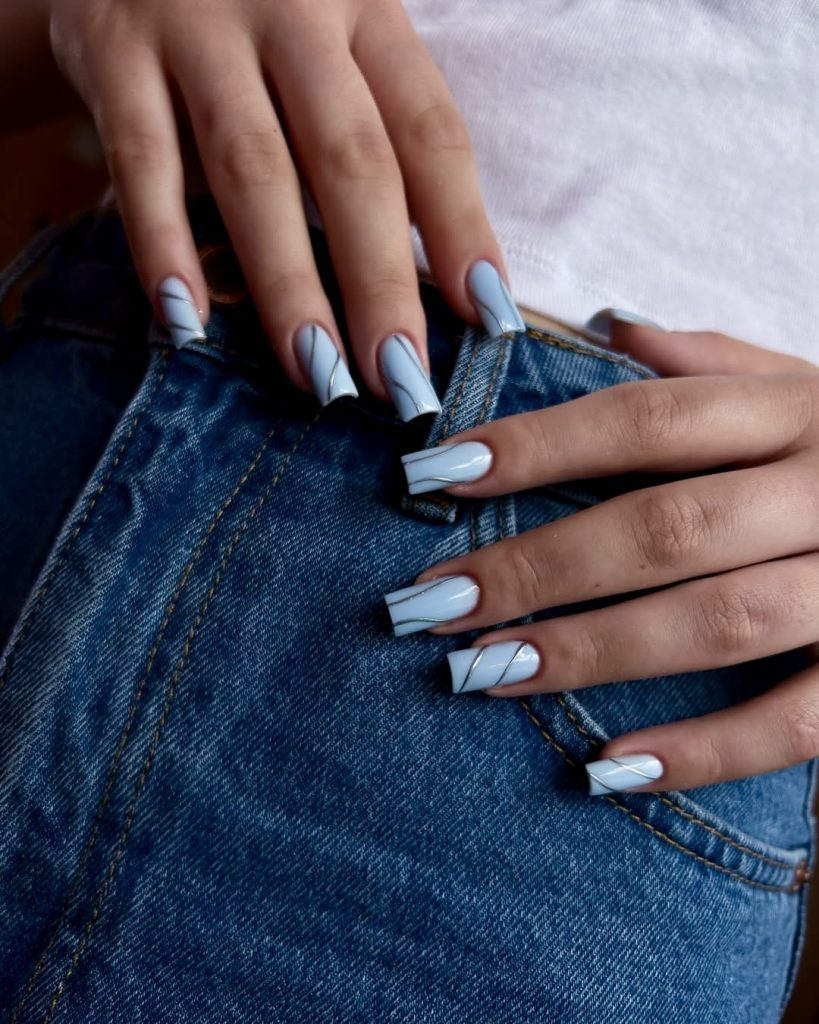 This style epitomizes modern minimalism in a remarkable way with the new square nail shape and icy blue base. The addition of the thin diagonal lines gives the design’s point of view an artistic perspective, thus it is ideal for women who are into clean designs with a graphic twist. This set not only adds sophistication to any denim outfit, but the bright color also makes it look fresh and chic throughout the summer months.