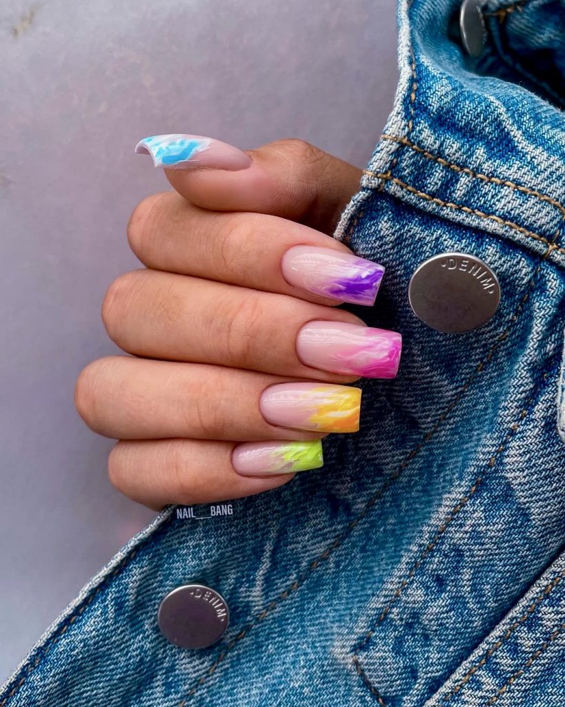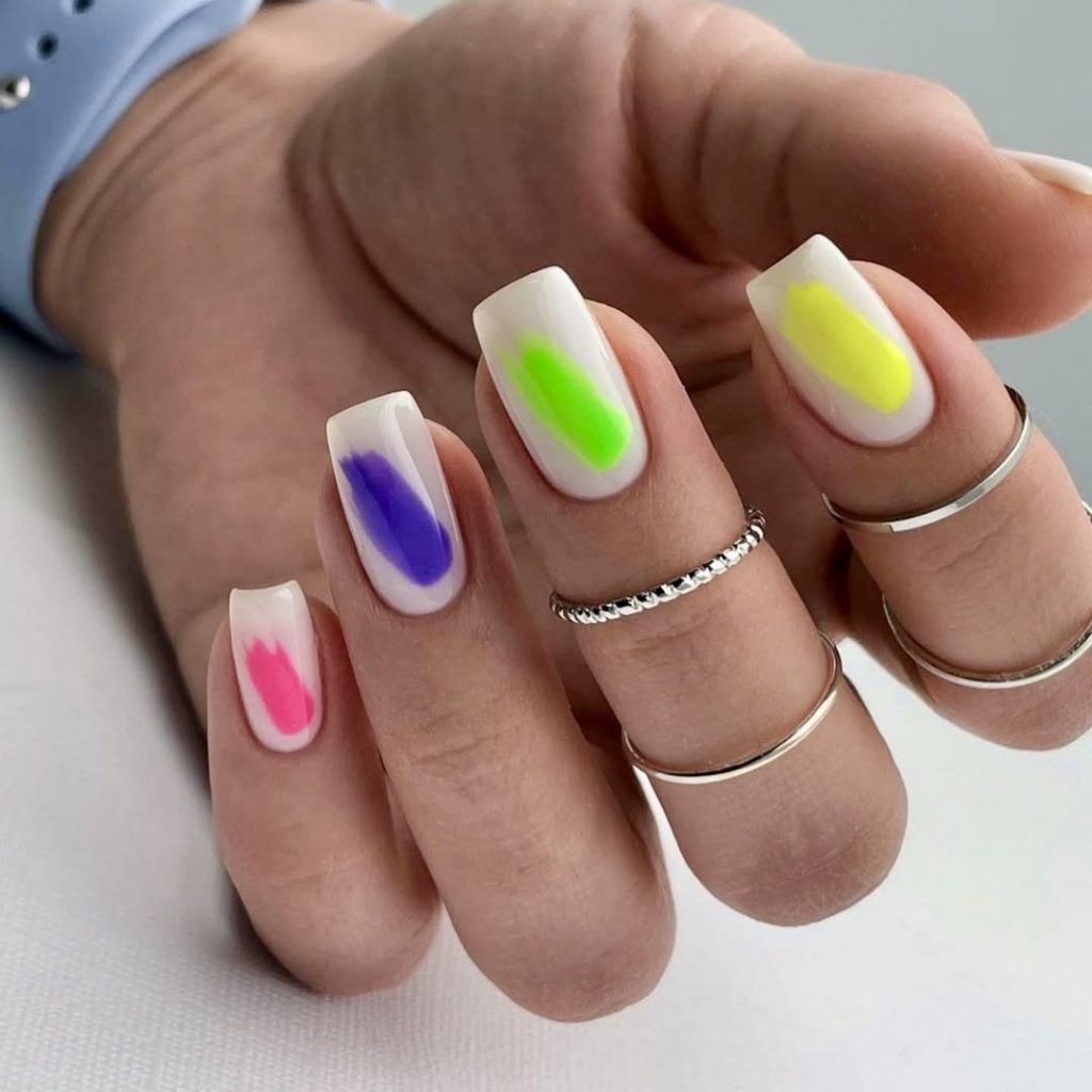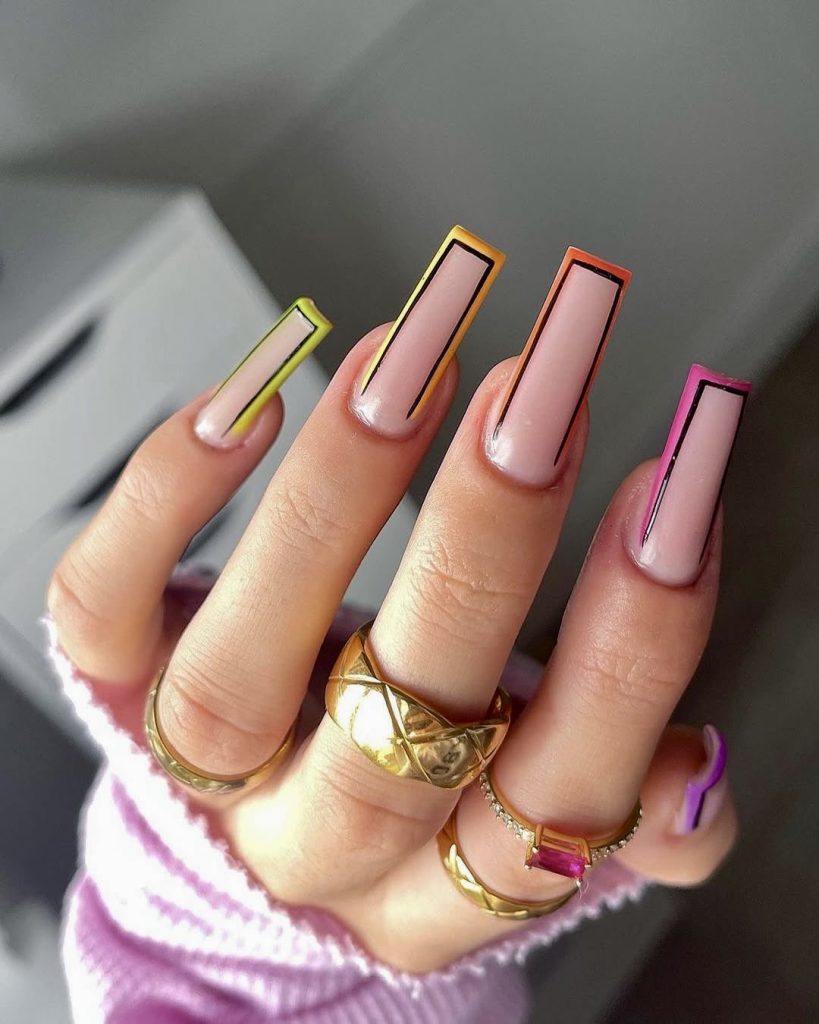 For the real trendsetters and street-style lovers, this acrylic square set with bold outline tips in varying neon colors is a visual standout. Each nail is a negative space center framed in high-impact colors like lime, orange, fuchsia, and so on making it an ultra-modern, sleek version of summer nail designs. This is a combination of edginess and cleanliness that makes it perfect for someone who wishes to have a nail type that appears to be both artistic and fashion-forward.
