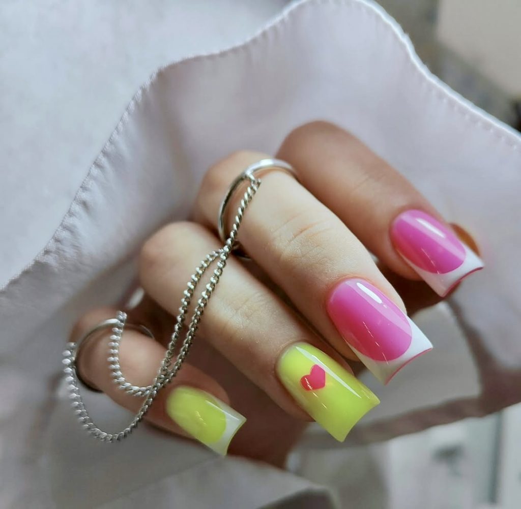 This square nail motif is reminiscent of summer retro style and uses the combination of high-contrast pink and neon yellow colors, together with a small heart accent, for more liveliness. The typical French tip is presented in a completely different way, colored and bright, which adds a charming, youthful aspect to it that is perfect for summer outings. The bright color scheme is bound to cheer you up, while the little detail makes it your own.