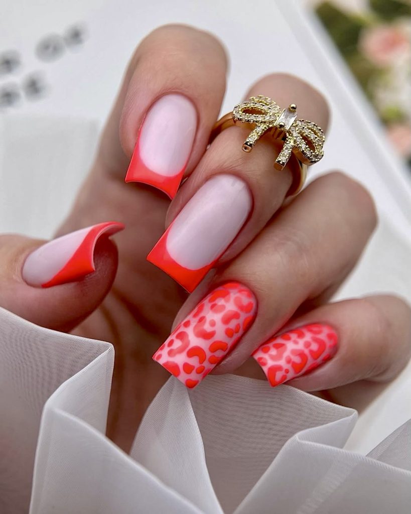 This French tip square nail type set that is mixed with medium coral red color and a playful twist of leopard print in a pink-on-pink palette is absolutely fascinating. It is a fierce and flirty combooe of summer and is one of the hottest trends of 2025 that we have encountered. The two colors are genuine partners in crime making the complete set the perfect one for the wearers who are updated with the latest trends and who want their hands to reflect the same vibe with their clothes, be it at the poolside or brunches on the rooftop.
