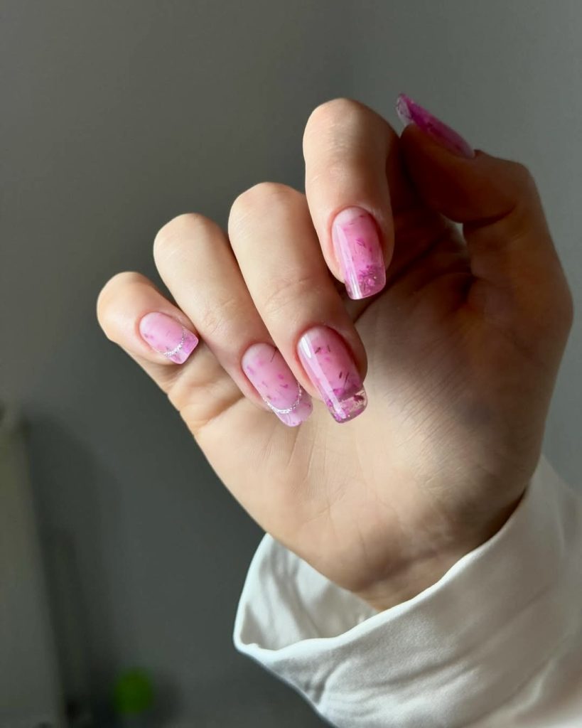 This medium-length set shows off a delicate translucent pink base adding beautiful glitter and subtle foil flakes, thus, creating a simple yet romantic look. The light attracts the young glossy effect so beautifully that the design fits both casual and more polished outfits equally well. If you are searching for nail designs to feel the clean, feminine, and very elegant style in your summer days that are easily achievable this is the design for you.