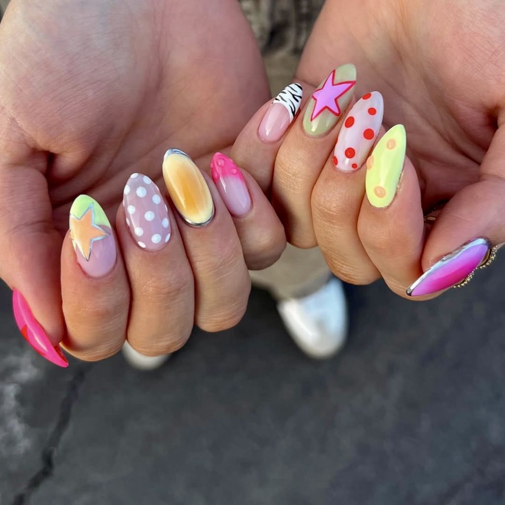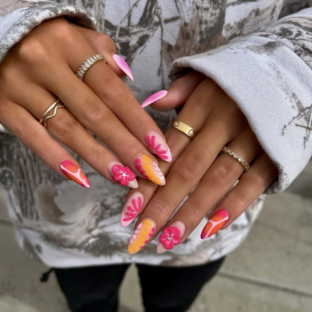 Embracing the trendy vibes of the ’70s, this striking nail set fuses pink, orange, and yellow colors into the boldest like florals, abstract petals, and groovy dots. The stiletto style contributes to the drama, whereas the lively palette infuses it with an exact cheerful feeling. These nails are about boldness only-fun, nostalgic, and excellent for matching with boho prints or a light summer romper.