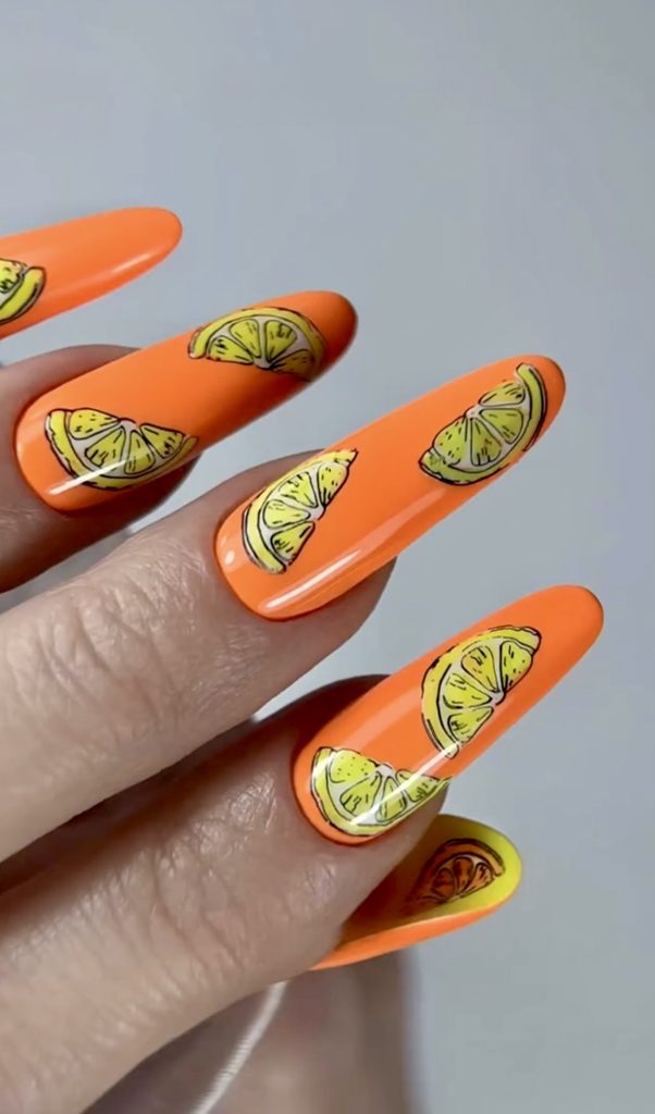 Acrylic nails are the real summer moment, and this particular type makes lemons practically real on a bright orange bartop. The bright colors and tropical designs are like a vacation on your fingers. It’s one of those extra styles that complete the outfit perfectly with bright jewelry, sundresses, and a sunny trip.