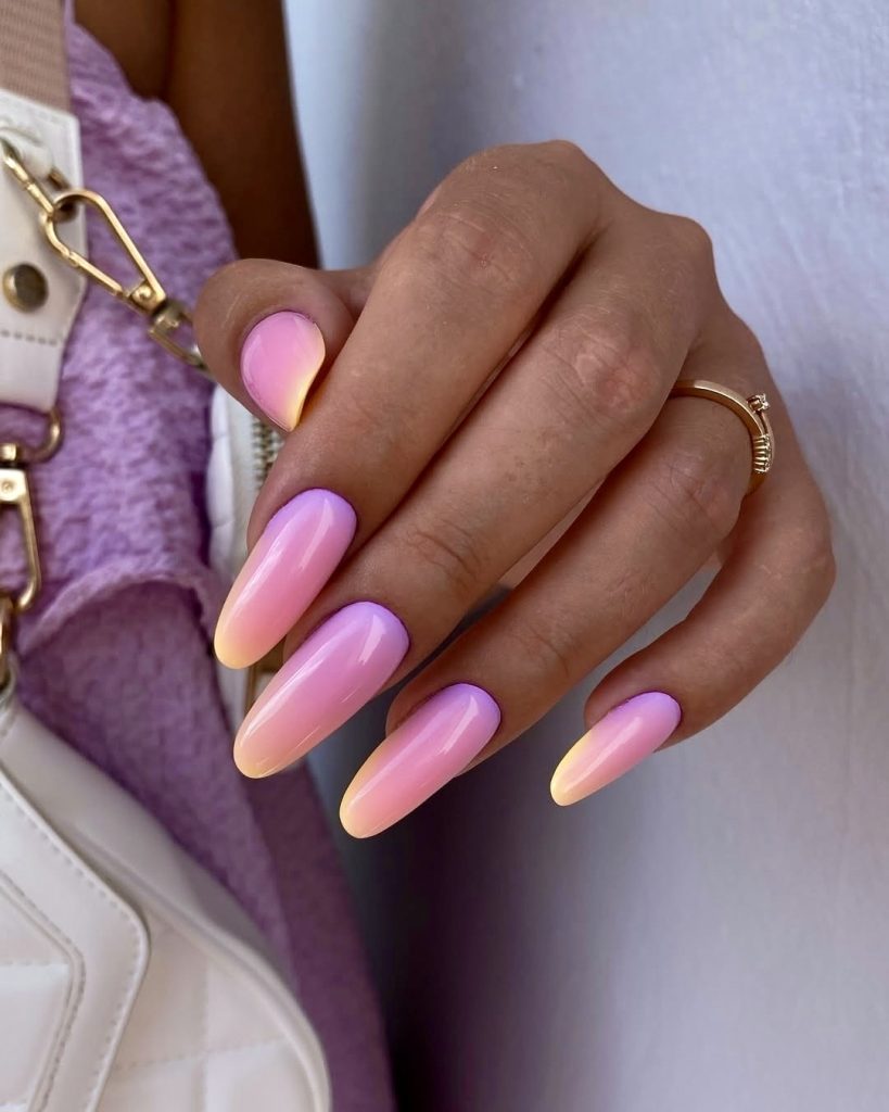 The almond nail shape, which is so beautiful, has a color that goes from lavender to soft yellow and peach, making it a candy-like gradient with mirror gloss. It’s a chic design that can be worn both in the daytime as a soft look and in the evening with a more formal look. This set is the living example of that bright summer feeling, being a perfect match with a pastel dress or a minimal outfit.