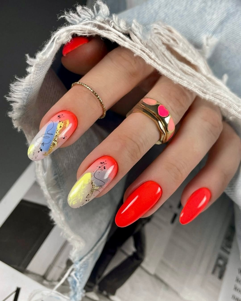 Bright and creative, the acrylic set consists of electric red polish and yellow, blue, and gold hand-painted splashes. The brushstroke and foil effect makes every nail a tiny canvas, and thus, you will have high-energy drawings on your fingertips. It is that type of brave set that goes perfectly with ripped denim and a statement tee—totally a creative expression for summer 2025.