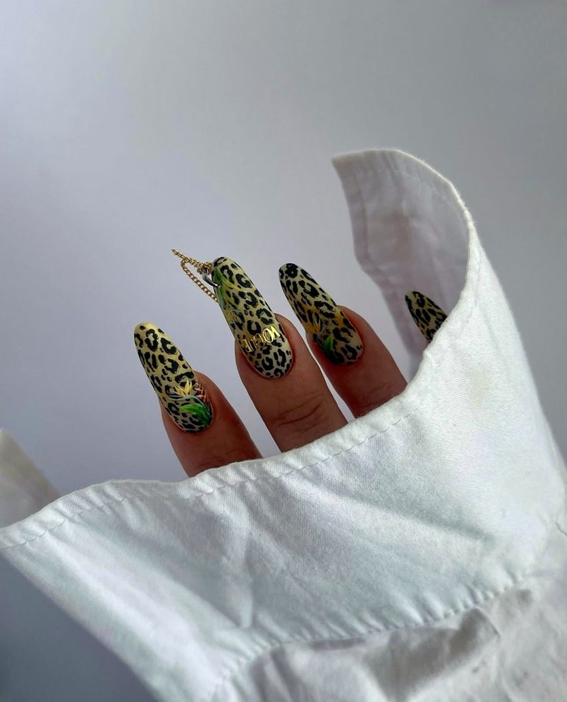 This look is a fearless combination of the long summer nails 2025 spirit and a brave nature. The almond-shaped nails are mostly adorned with leopard prints, which also have hints of soft yellow and are complemented by black lines. The distinctive feature of this design is the addition of charms like a 3D gold dangling chain on the finger that brings it more to life. You might think that such a dramatic acrylic nail set is just too much but, for those whose fashion speak is only loud, it showcases assertiveness and strength. The best way to wear it is together with a neutral white shirt or a minimal outfit, thus, your nails will be the highlight of your look.