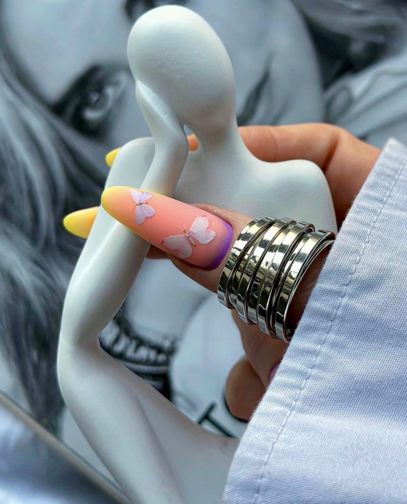 So chetyr butterfly-themed nail design is a dreamy, romantic summer style to the max. It has a color gradient that changes from yellow at the base to soft pink and lavender at the tip, a magical look of dawn. Three delicate butterflies seem to be swimming in the air, giving an airy and light feel to the acrylic base. This style takes the 2025 trend and pushes it forward by using soft, and fantastical-related elements. The style is perfect for women who like it very much to express through designs the gentle elegance but at the same time, to keep the visual influence. Just carry out the airy floaty dresses or pastel dresses for the look to be effortless.