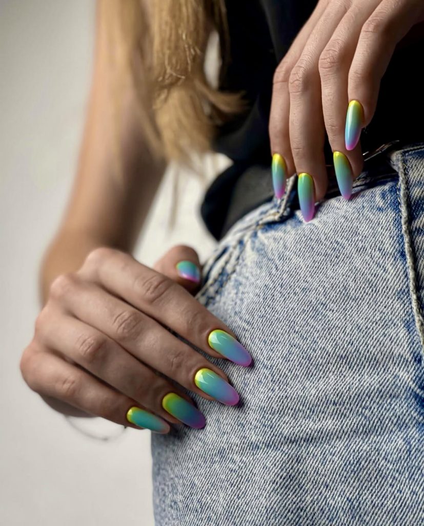 Imagine yourself in 2025 and being surrounded by colors! The tropical chrome-inspired cooler is a real explosion of colors, featuring blue, lime, purple, and yellow that come together in a sleek metallic finish on a long thin luego style nail. It is a must-have for those who prefer color daring and extra energy in their summer look. The color transition is reminiscent of the tropical sunrise, and it goes perfectly with denim or rebellious accessories – it is just pure genius. This one deserves a brave heart; only those women who are willing to be in the middle of attention can wear it, be it on a rooftop party or any festival.