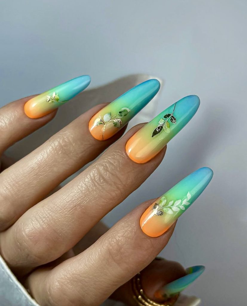 Channeling the warmth of the sunset and breezy beach vibes, this look boasts a scintillating gradient from tangerine orange all the way to turquoise blue. What adds an artistic touch to this set is the super-fine botanical detail on every single nail—tiny leaf illustrations in delicate white and green, which gives it a handcraft-style. These acrylic nails are long and elegant; thus, they manage to balance the vivid colors with the natural design. If you are searching for concepts that merge acid tones with a chill summer mood, this pattern is a yes. Wear it with tropical prints, gold accessories, or breezy beachwear to match its lush vibe.