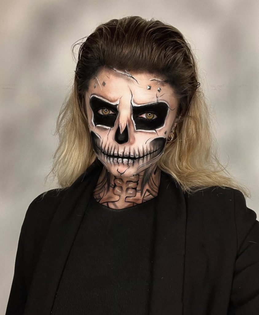 The look of having a cracked skeleton is somehow beautiful hauntingly especially since it involves combining horror with high drama. The chipped forehead and the contrasting black eyes create a whiff of a soul that is divided into two worlds. It’s intense, raw, and mesmerizing. The up-combed hair and the fierce eye drag the entire atmosphere into hammering horreur, as a villainess has just stepped out of set in a Tim Burton fantasy.