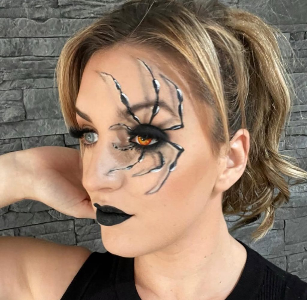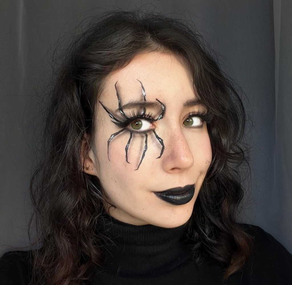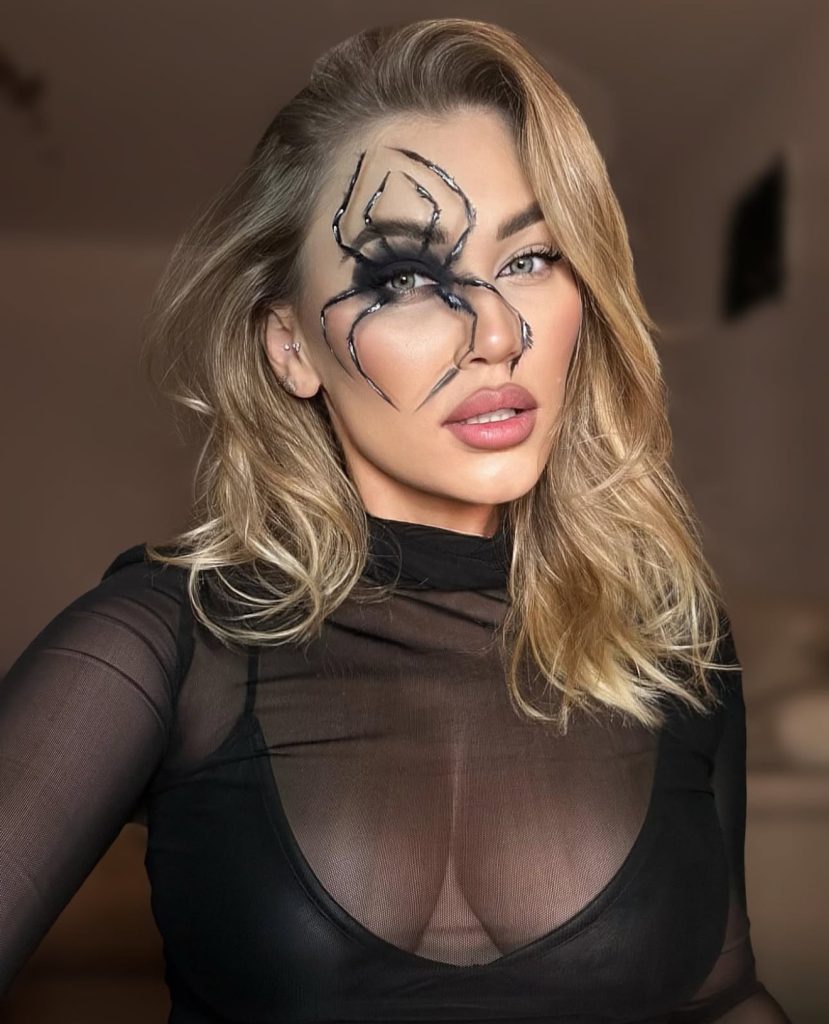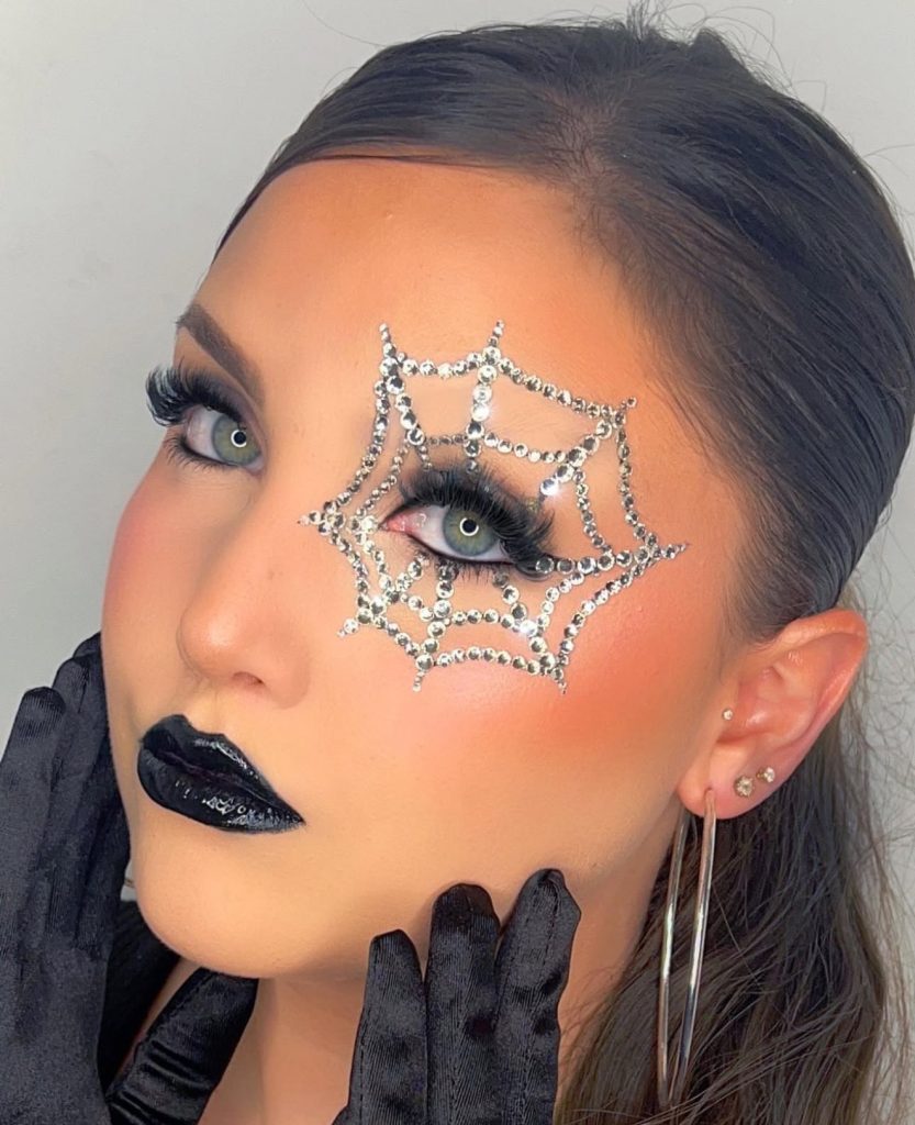 This is how you can do Halloween yet still feel fabulous. There is the art of some thick spider-webs all studded with crystals, but daring and delicate as though it were a masquerade-mask of triggered light. It combines with jet-black lips and voluminous lashes to provide full discret facile glam, which is dramatic but one you can do even in case you are not the one to embrace Halloween.