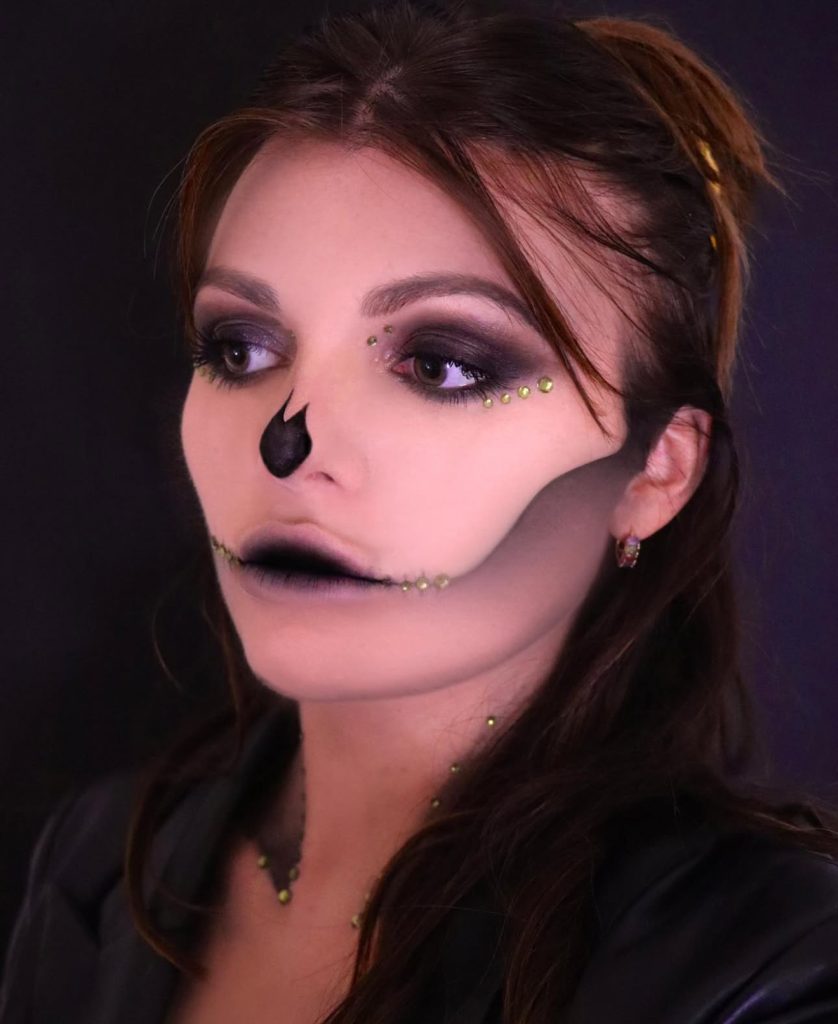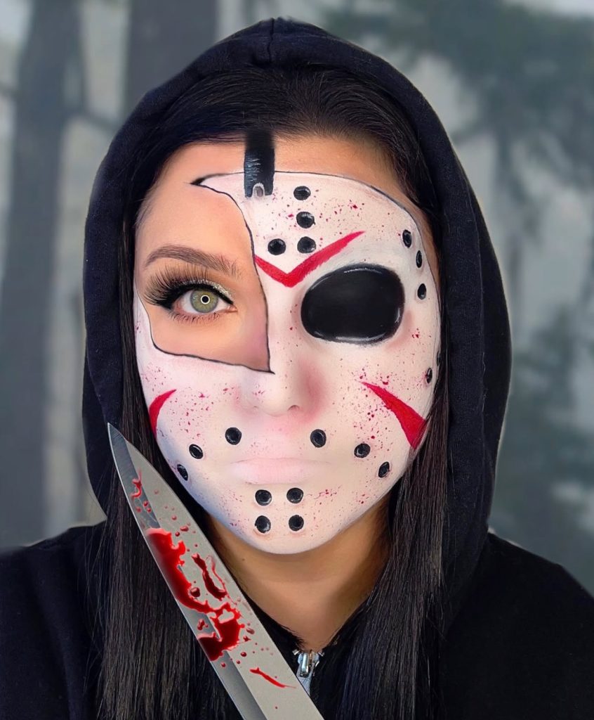 This daring idea is most suitable with women who have something out there and a touch of makeup. The shape fits oval or angular face types and medium or fair skin. Paint white cream color, darken with some black shadow and add some fake blood. Then combine it with a hoodie and you become a legend.