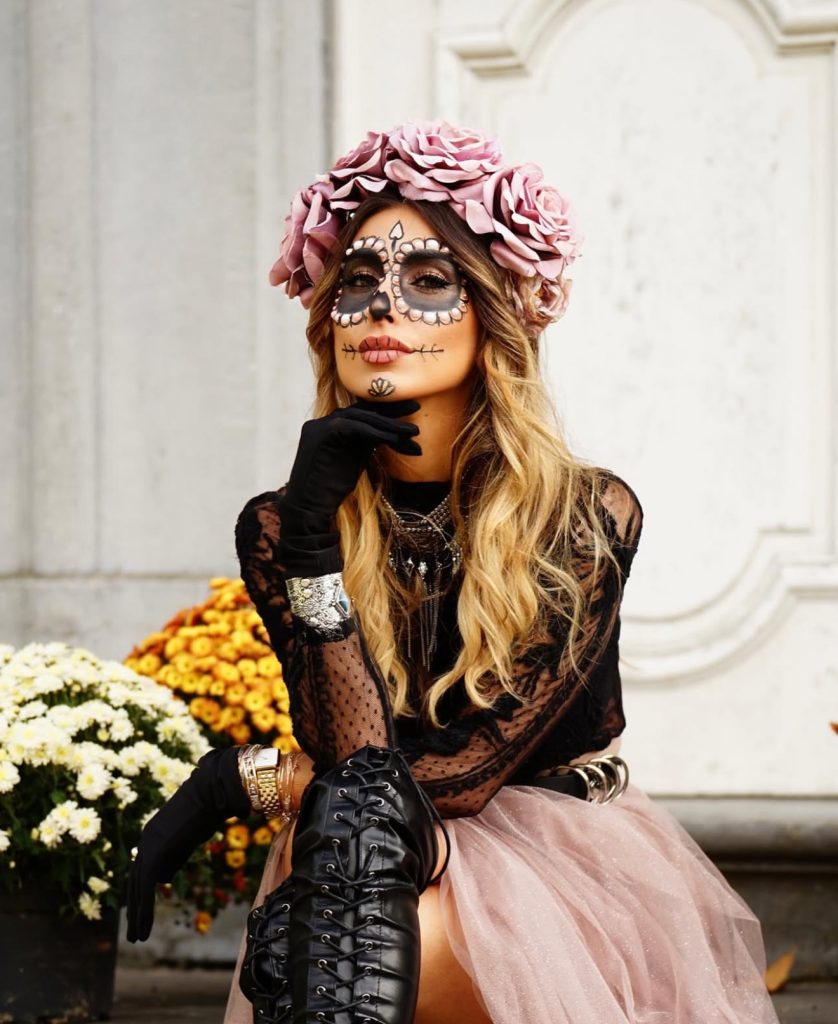 Such a stunning mexicain look at makeup with the sugar skull reminds me of a romance of the root and femininity. The face painting, with thorns in the shape of a crown of roses, is ceremonial in nature, the feel is like that of bearing witness to a tradition and having the center of attention simultaneously. It’s poetic, fierce, and picture-perfect for 2025.
