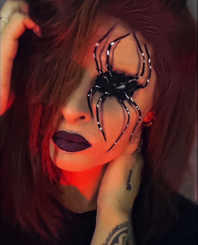 As you may have always wished to incorporate fear into fashion, this glam araignee look is it. The spider designMontage on one of the eyes is enigmatically flashy, not too opulent but definitely surreal and attention-catchy. The wide tippy waves, shiny lips make the overall vibe less intense, but, still, there is some contrast that appears magnetic, modern, luxe, and a little bit dangerous.