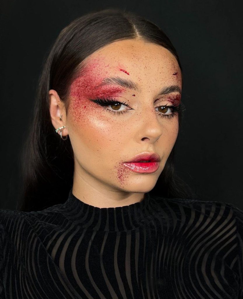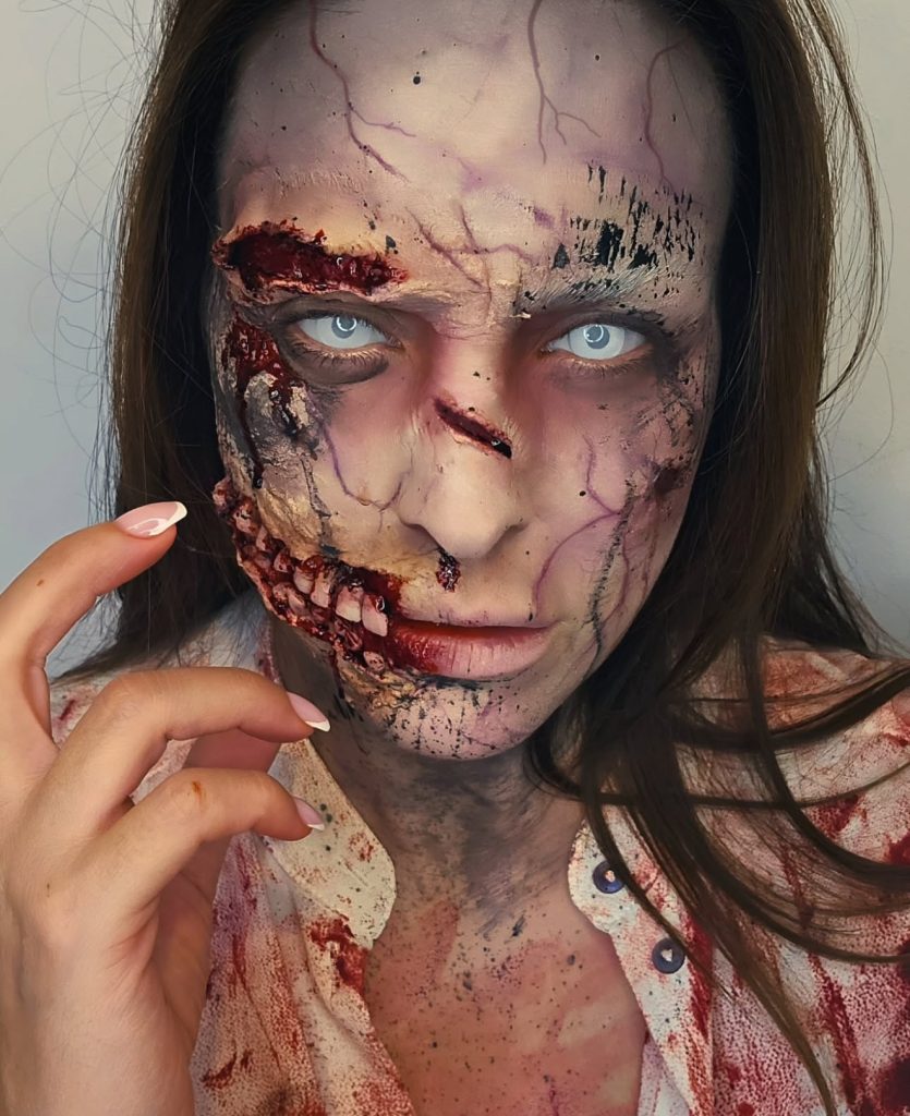 This one’s all about layering. Put on prosthetic putty or scar wax around the face, add some purple and red cream coloring pigments and do not stint on the fake blood. It is best used by people who are ready to commit to it entirely, which is not a casual thing. Perfect for photo ops and dramatic entrances.