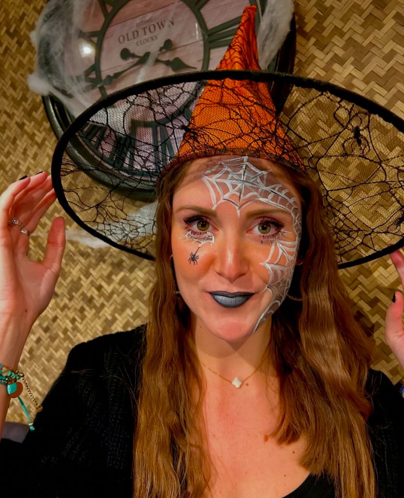 Old-fashioned, playful, and somewhat nostalgic – this joyfully weird sorciere facile enfant makeup is a bit of levity during the season of horror. White spiderweb and the small spider making his pathway up the cheek are humorous, not threatening. Combined with a lace witch hat and grinning swagger it is more of a celebration rather than a scare-fest.