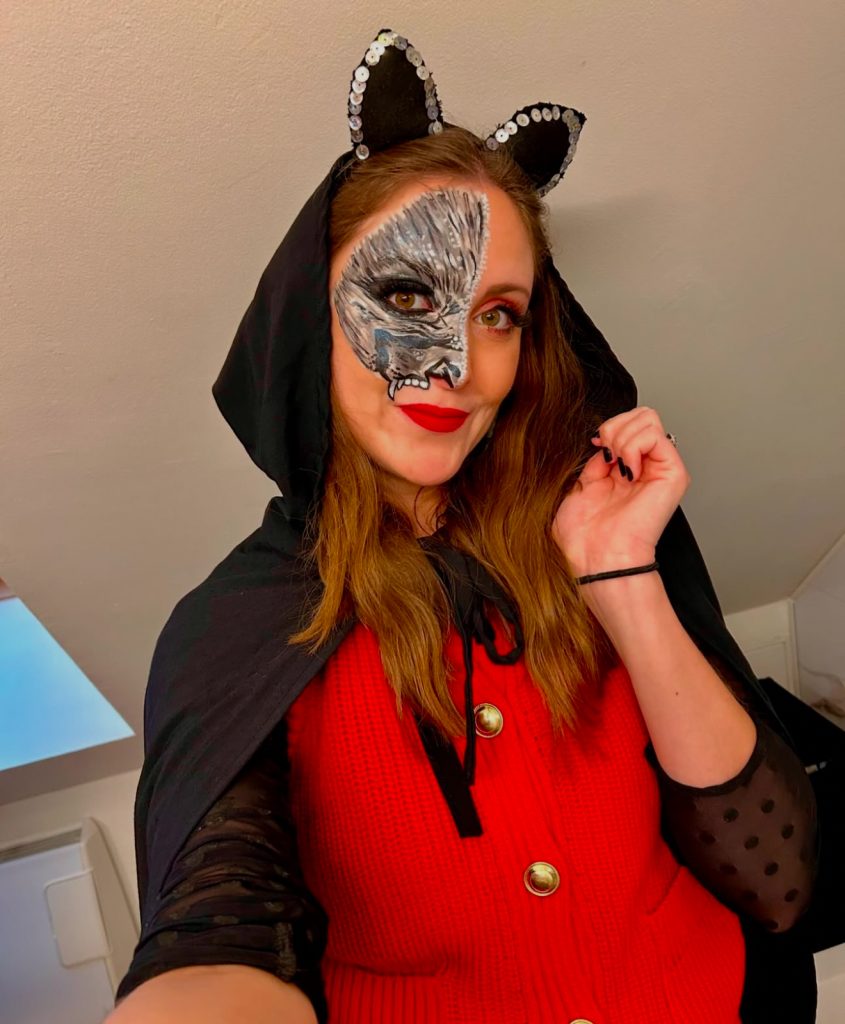 This is the twist that we did not see coming, half Little Red riding Hood, and half the big bad wolf! The furry snout and the smoldering eye make-up add the correct touch of griffure visage fantasy. And that red cape? Iconic.