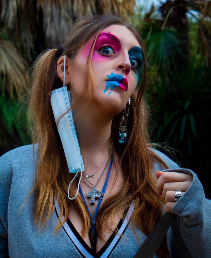 Part creepy and part weird, this clown makeup adds color blocking and some pandemic commentary. The blue and pink electric eyeshadow combined with the mask dangling off the ear makes your entire face a comic panel turned onto life. It’s weird, wonderful, and very now.