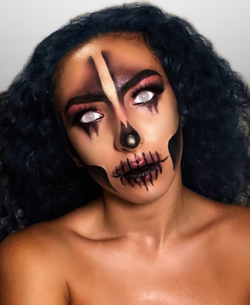 This creepy simple squelette appearance makes skull makeup look alluring and supernatural. Shining red shades and sewn lips contrast in perfect harmony with bright black details and white-out lenses. It is a skeleton that has just walked off a high fashion editorial set: beautiful, like a dare and completely memorable.