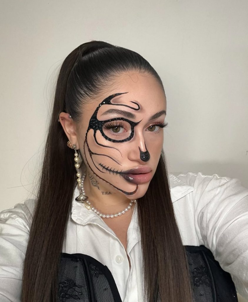 What’s better than a smoky eye? a smoky eye and around it a griffure visage of a spider getting out. There is drama all over this illusion makeup look- one amber eye pops out through the dark lines and the makeup seems to come alive, almost to be crawling. The sleekness of this creepy-cool appearance is completed with the high ponytail.