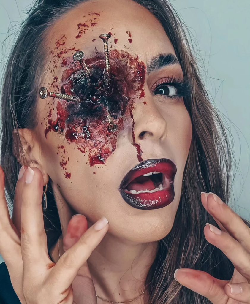 It is a hit among makeup enthusiasts who like to create a makeup style of their own. Suitable to all skin tones, though it makes the most striking difference on skin medium and lighter. Construct the base of the wound with liquid latex and tissue, and then feature fake screws (or painted ones!), so it makes a show-stopping impression.