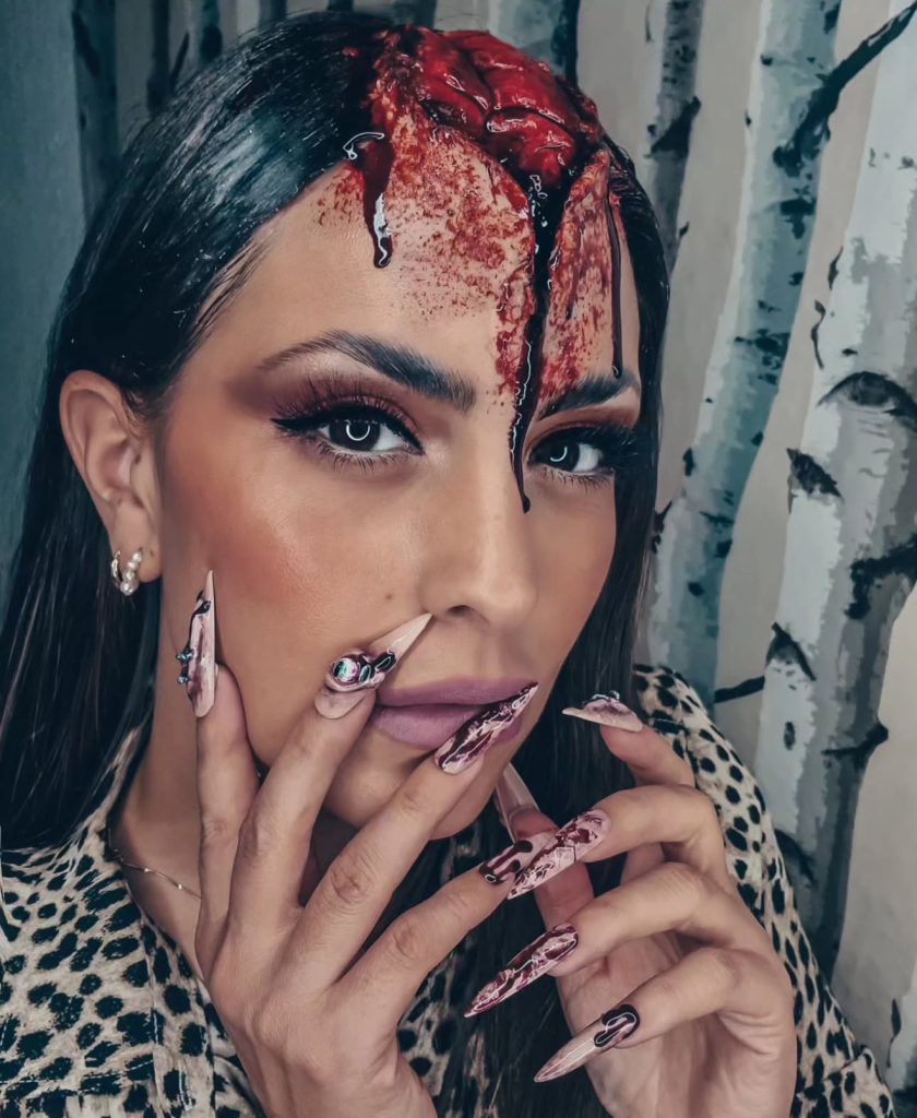 Not for the squeamish – this is a frightfully stylish image, with a skull head opened up to show a bloody griffure visage face and a glamorous polishes and eye-catching nails? Iconic. The smoothness of blood and the texture of gore coupled with the smoky soft eye make this horror-glam combination very feminine and daring.